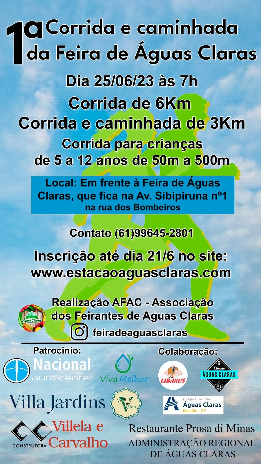 1 CORRIDA DE ÁGUAS CLARAS Dia 25/06/23 Distancia: 6 km Largada geral da feira de aguas Claras: 7:30Corrida infantil de 05 – 12 anos: 8:30