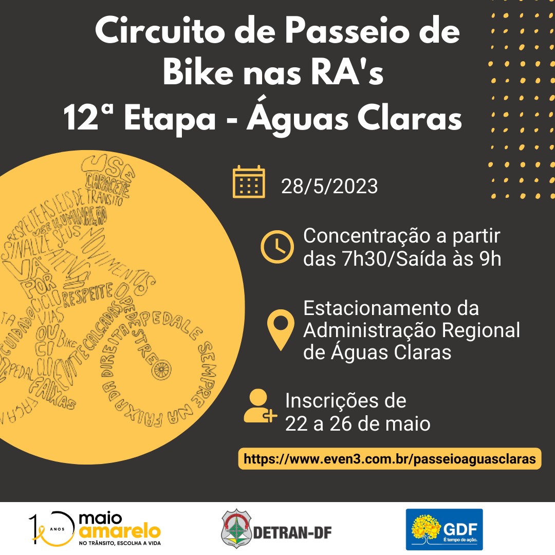 O Departamento de Trânsito do Distrito Federal realizará, com o apoio da Administração Regional de Águas Claras, a 12ª Etapa do Circuito de Passeio Ciclístico do